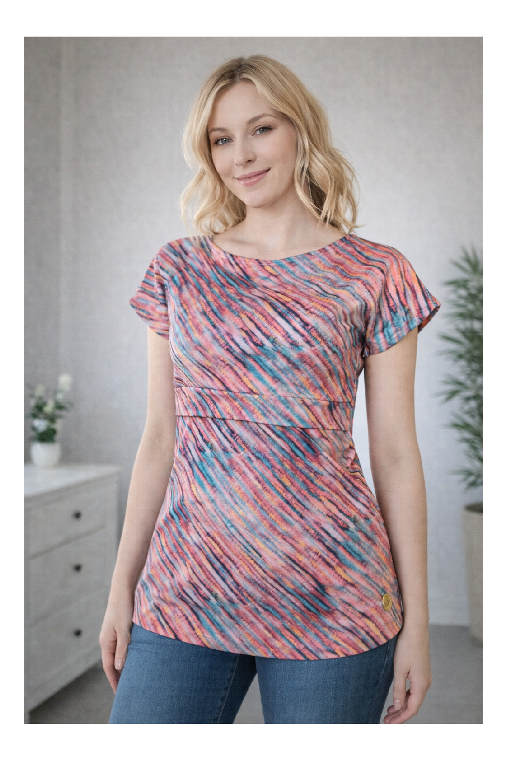 2) Vrchní část je zakončena ŠIROKÝM 3CM LEMEM pod prsy. Ten je nejen praktický pro snadný přístup ke kojení, ale právě díky své šíři krásně vrátí top na obvod hrudníku. Nikde netrčí nevzhledná záclonka a tričko tak dělá krásnou postavu i s poporodním bříškem.