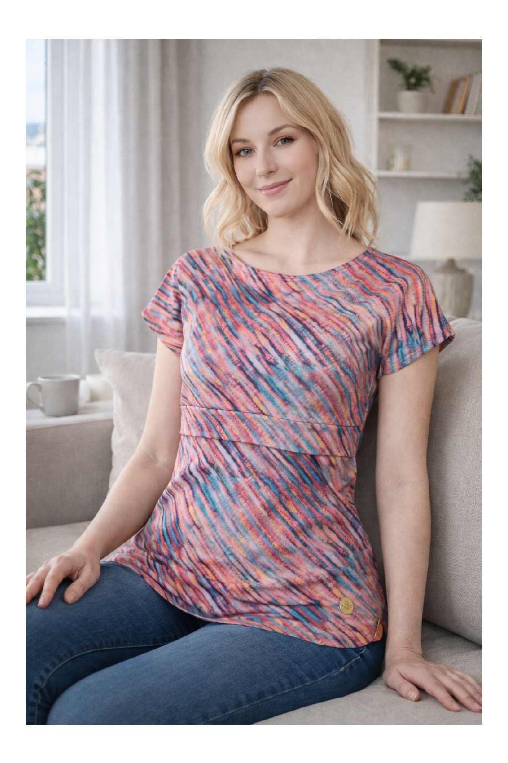 BIO bavlněné tričko s elegantním kimono rukávem, lodičkovým výstřihem a dvojitým předním dílem je navrženo pro Váš nejvyšší komfort při kojení miminka – je velmi příjemné na nošení, elegantní, prodyšné a nenáročné na údržbu. Budete se v něm cítit opravdu výjimečně.