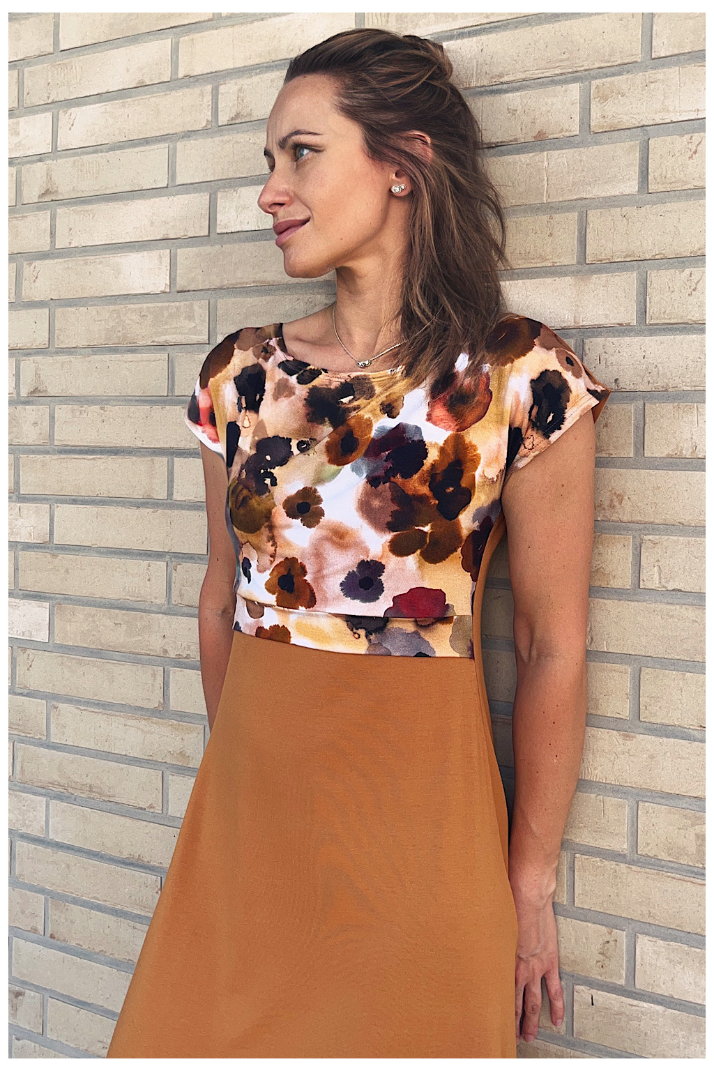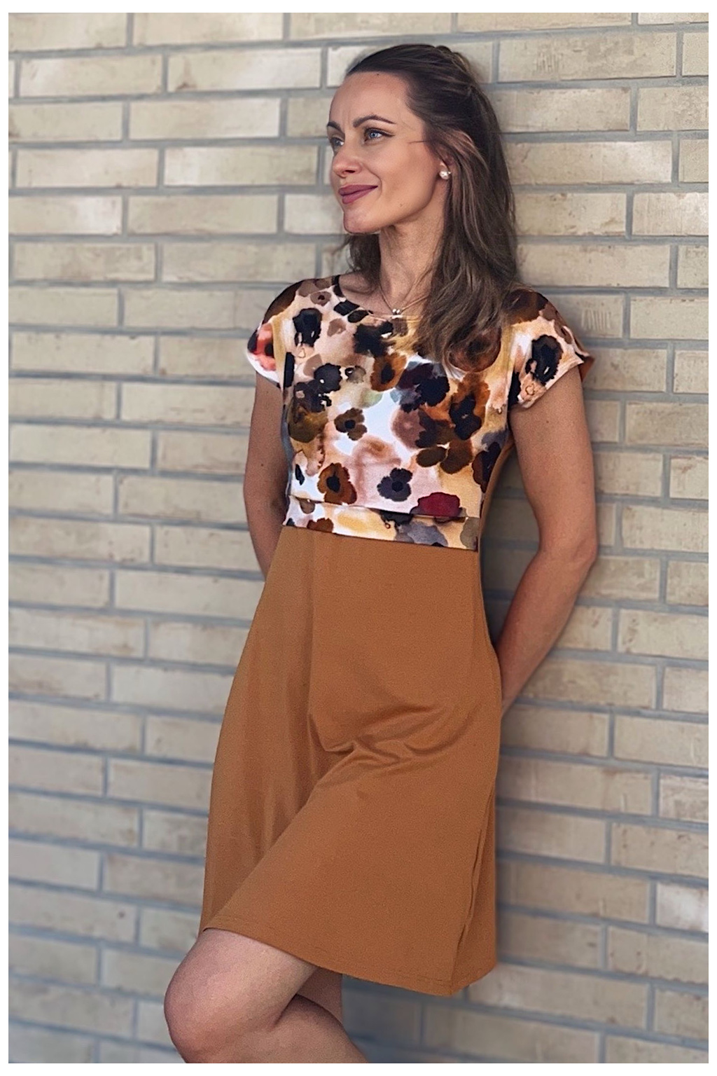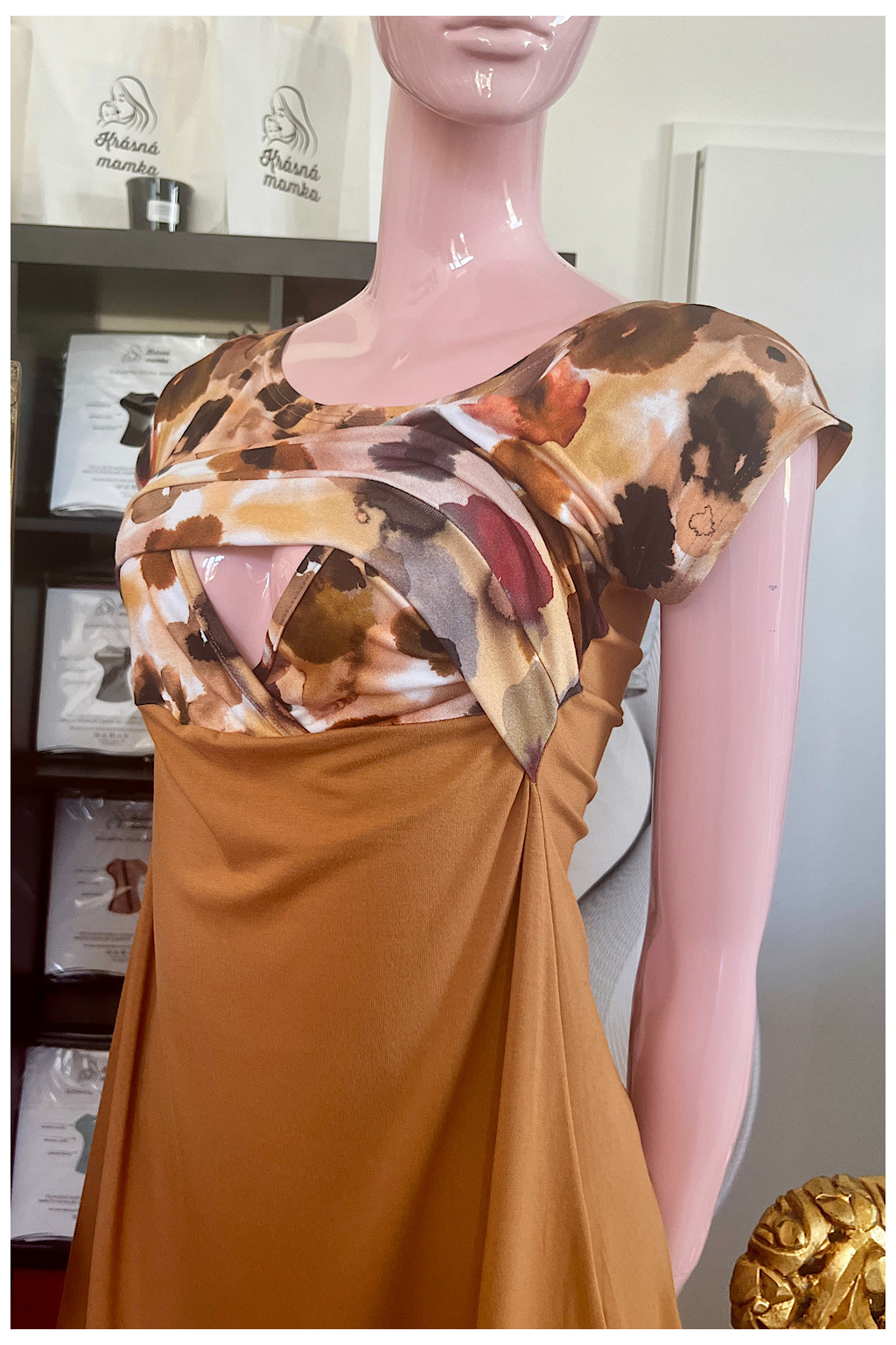 - tyto šaty mají nádhernou kombinaci zemitého klidného okrového odstínu s expresionistickým vzorem vrchního dílu