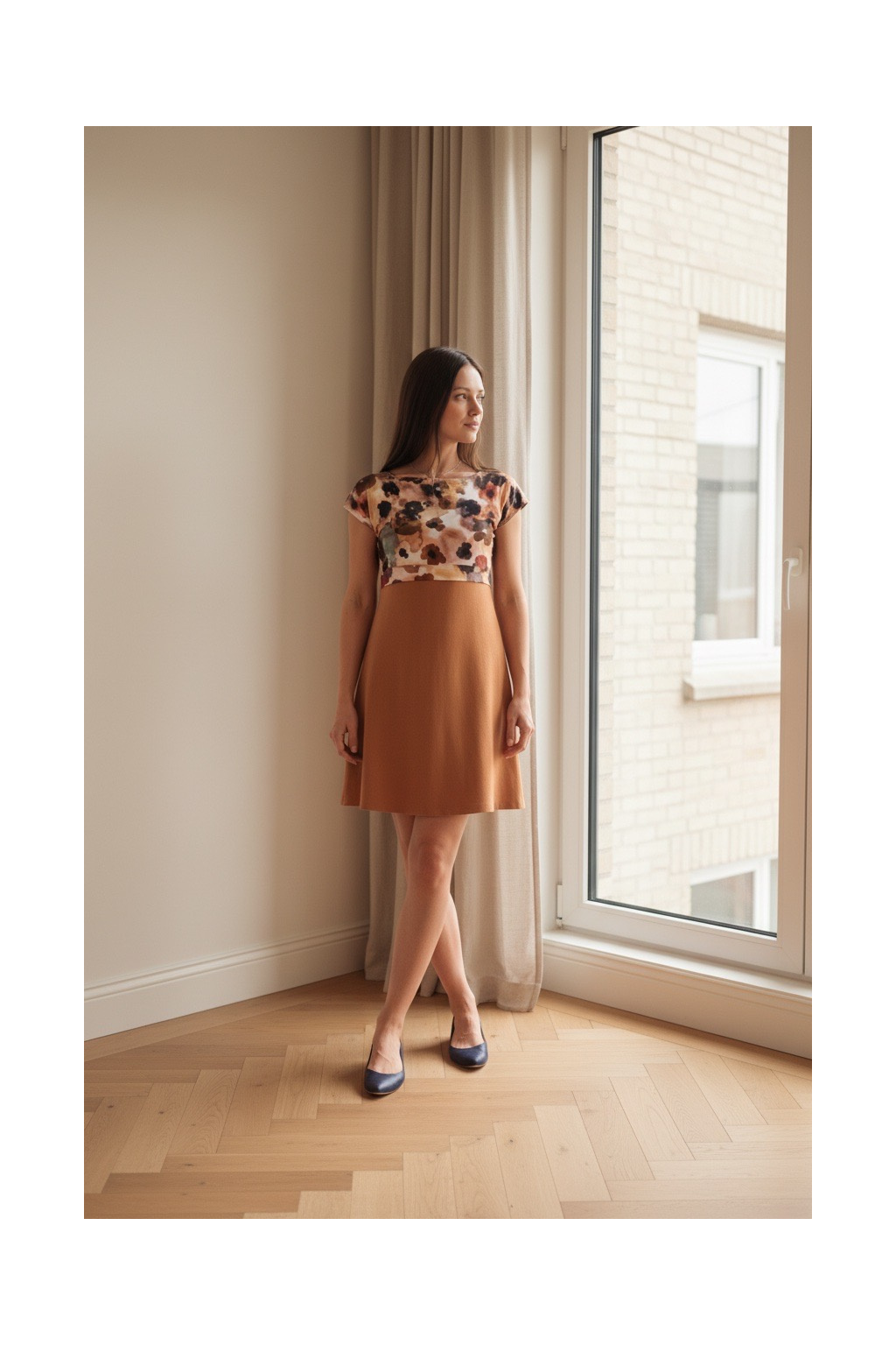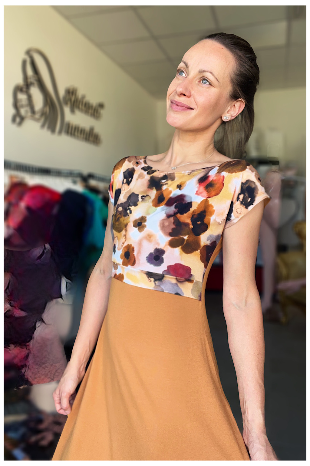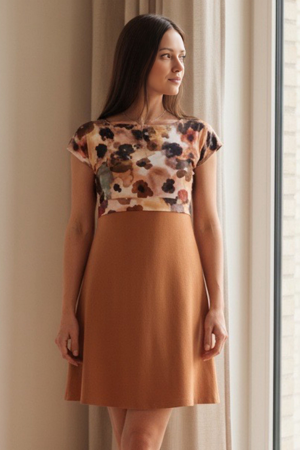 - tyto šaty mají nádhernou kombinaci zemitého klidného okrového odstínu s expresionistickým vzorem vrchního dílu