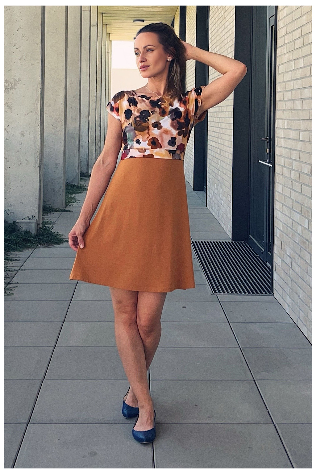- tyto šaty mají nádhernou kombinaci zemitého klidného okrového odstínu s expresionistickým vzorem vrchního dílu
