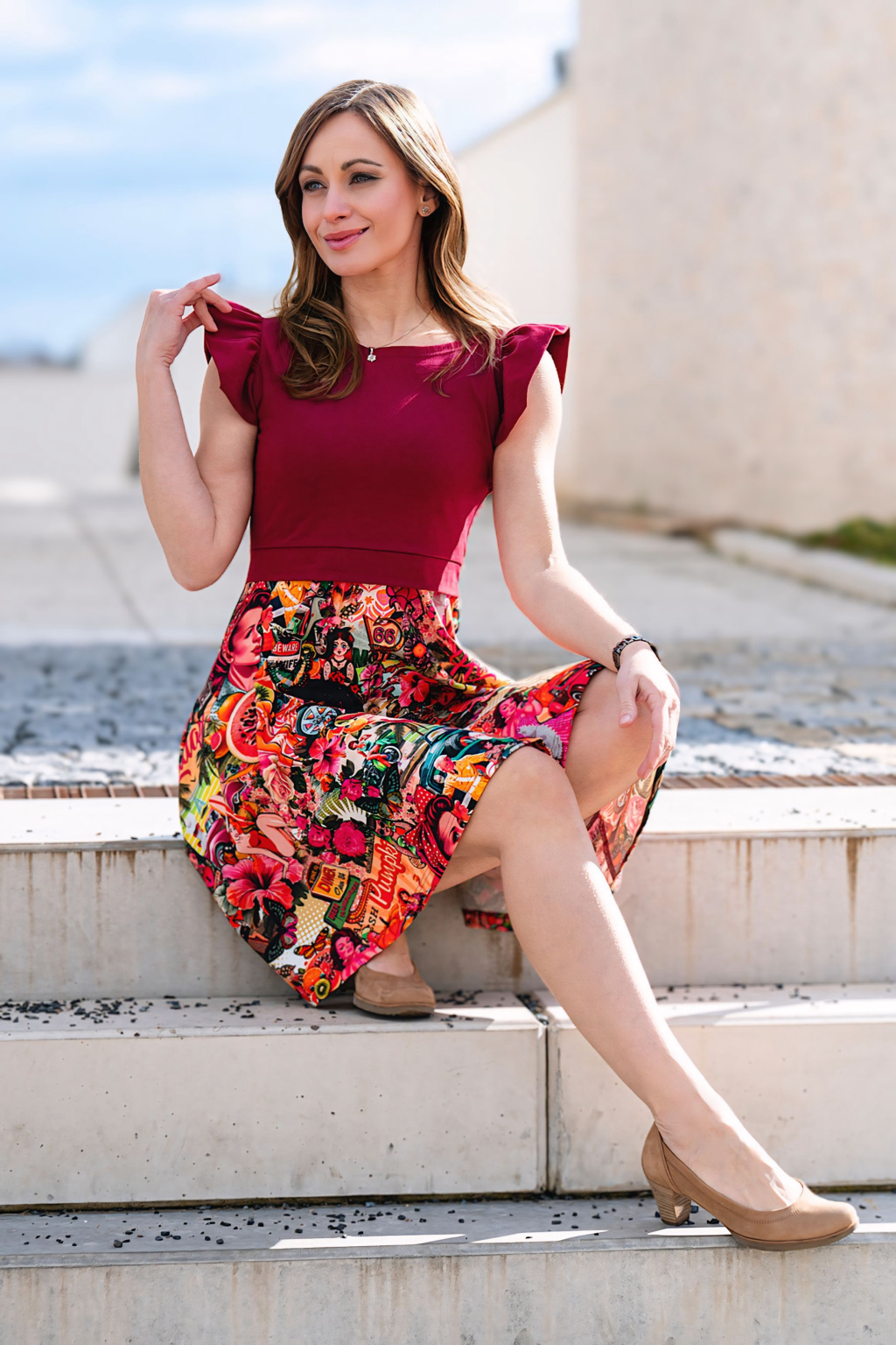 - šaty pro pohodlné kojení se širokou A sukní, kapsami a volánky