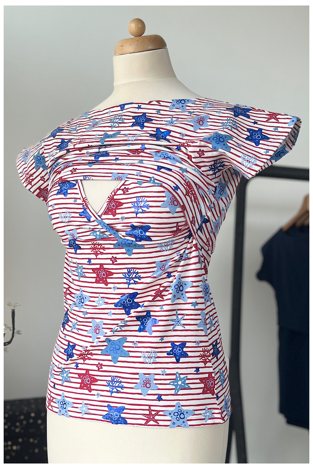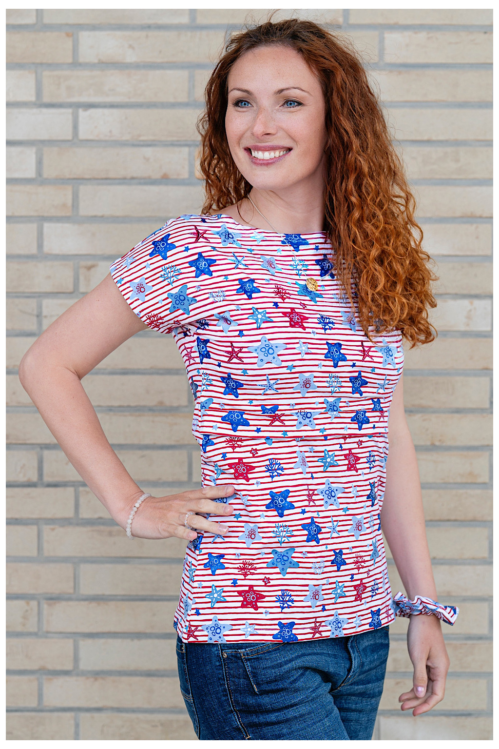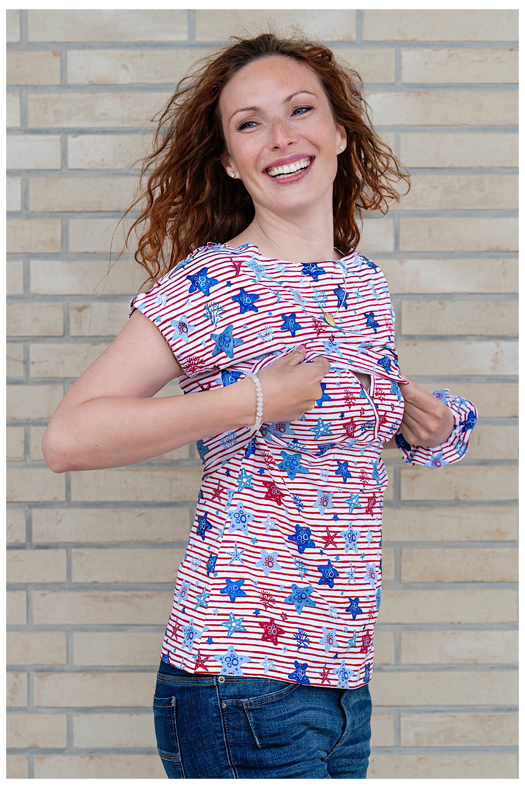 2) Vrchní část je zakončena ŠIROKÝM 3CM LEMEM pod prsy. Ten je nejen praktický pro snadný přístup ke kojení, ale právě díky své šíři krásně vrátí top na obvod hrudníku. Nikde netrčí nevzhledná záclonka a tričko tak dělá krásnou postavu i s poporodním bříškem.