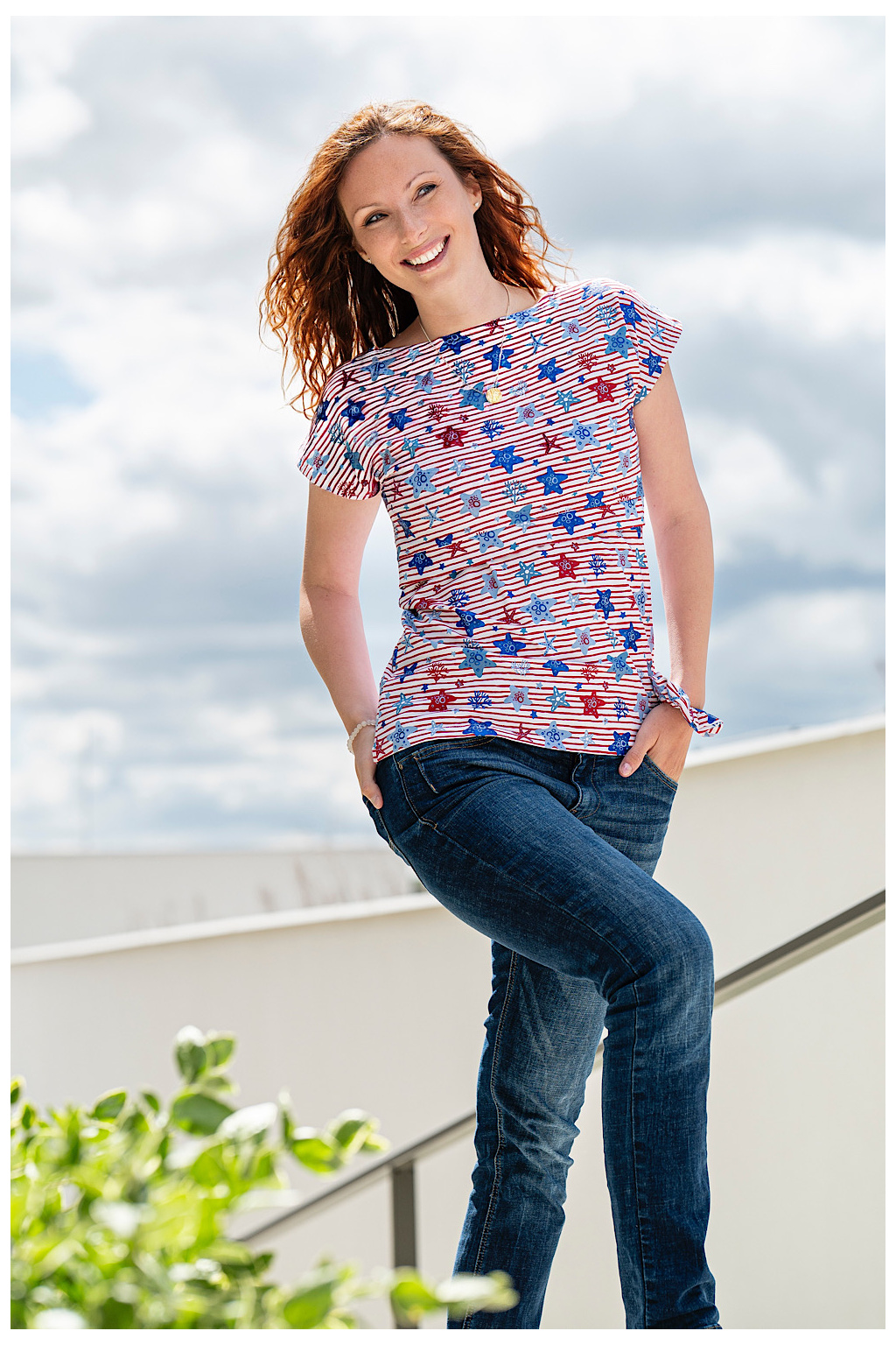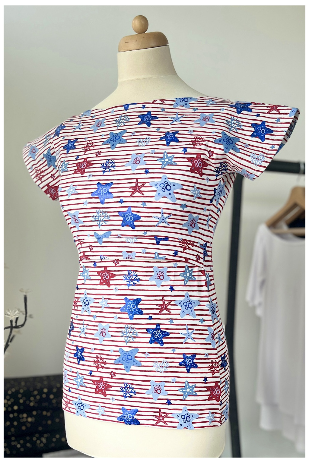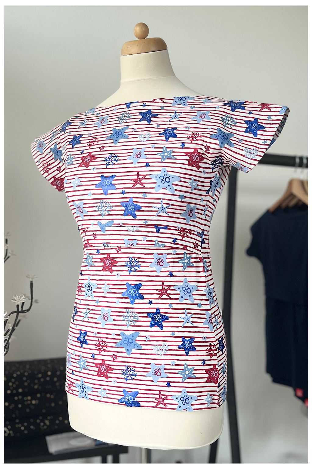2) Vrchní část je zakončena ŠIROKÝM 3CM LEMEM pod prsy. Ten je nejen praktický pro snadný přístup ke kojení, ale právě díky své šíři krásně vrátí top na obvod hrudníku. Nikde netrčí nevzhledná záclonka a tričko tak dělá krásnou postavu i s poporodním bříškem.