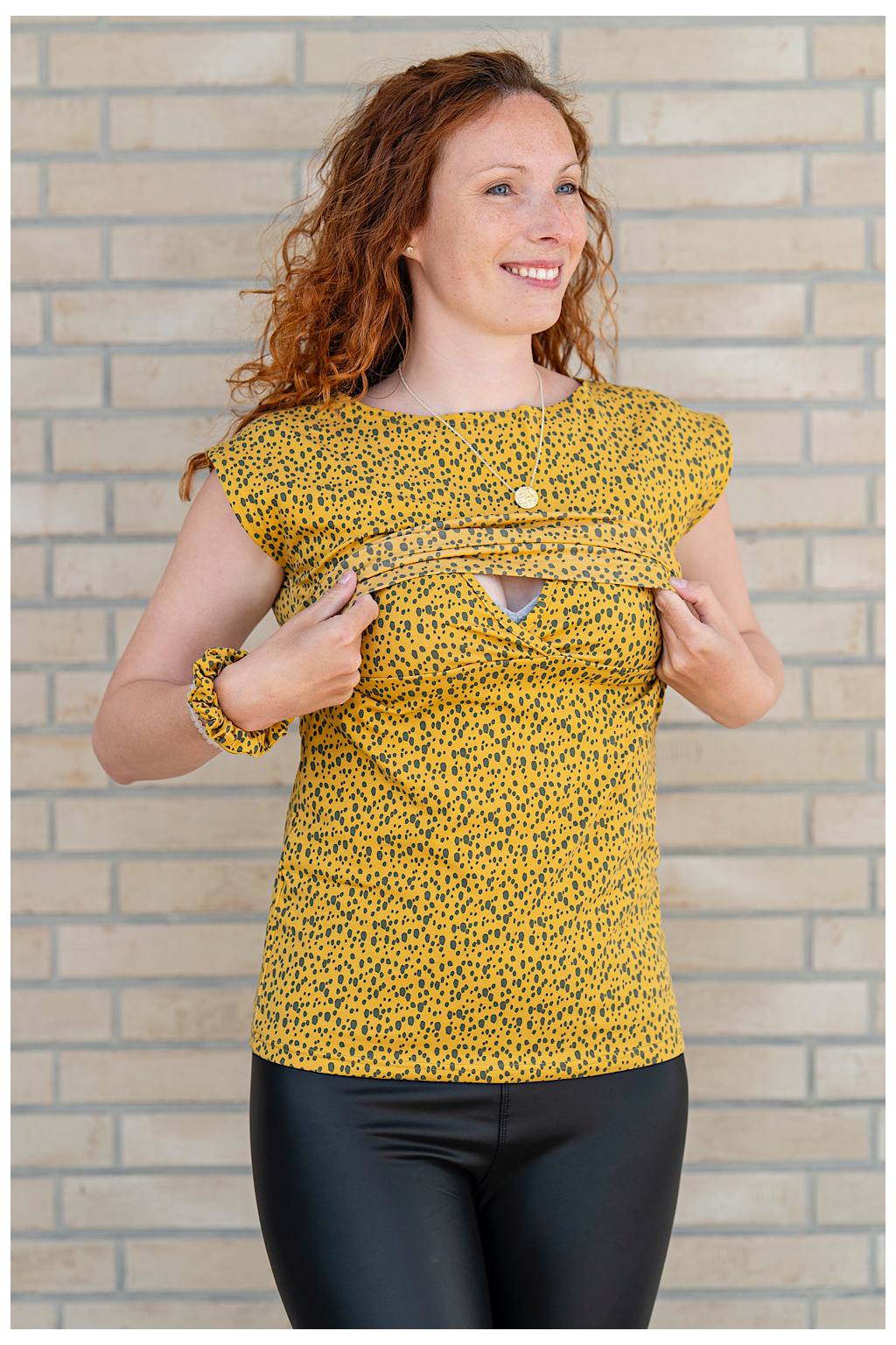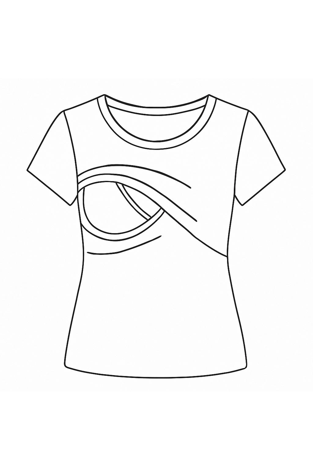 2) Vrchní část je zakončena ŠIROKÝM 3CM LEMEM pod prsy. Ten je nejen praktický pro snadný přístup ke kojení, ale právě díky své šíři krásně vrátí top na obvod hrudníku. Nikde netrčí nevzhledná záclonka a tričko tak dělá krásnou postavu i s poporodním bříškem.